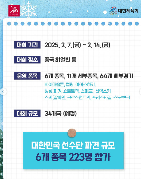 2025년 2월 7일부터 14일까지 중국 하얼빈에서 개최되는 하얼빈 동계 아시안게임은 아시아의 겨울 스포츠를 대표하는 국제 대회입니다. 이번 대회에는 총 34개국이 참가하며, 대한민국은 223명의 선수단을 파견할 예정입니다. 다양한 종목에서 치열한 경쟁이 예상되며, 많은 스포츠 팬들이 관심을 갖고 있습니다.