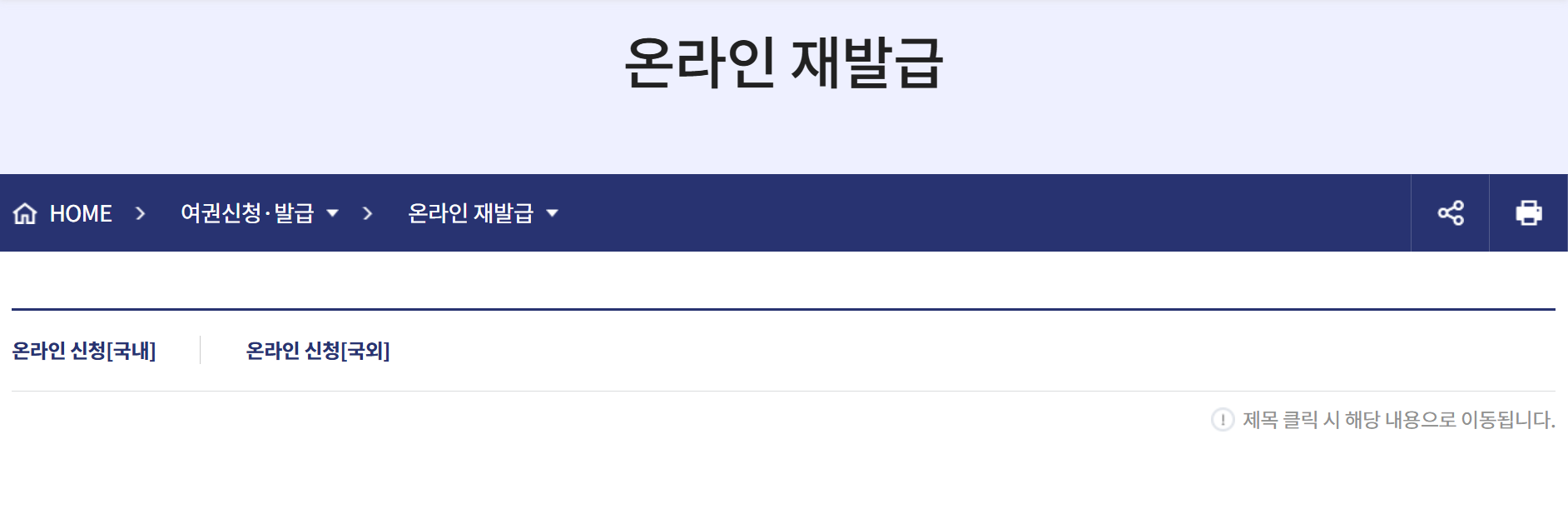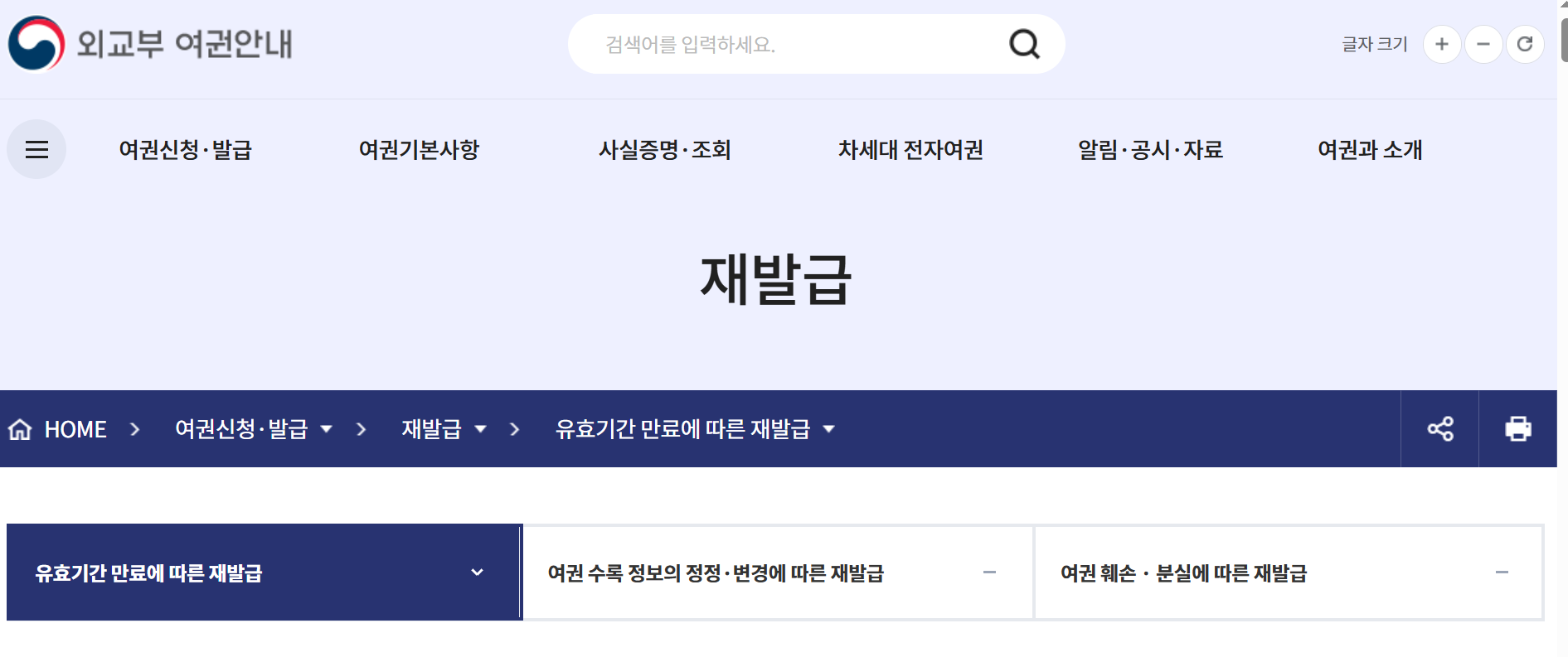 - 여권 재발급 메뉴 선택 ▶ 메인 페이지에서 "여권 재발급" 메뉴 클릭